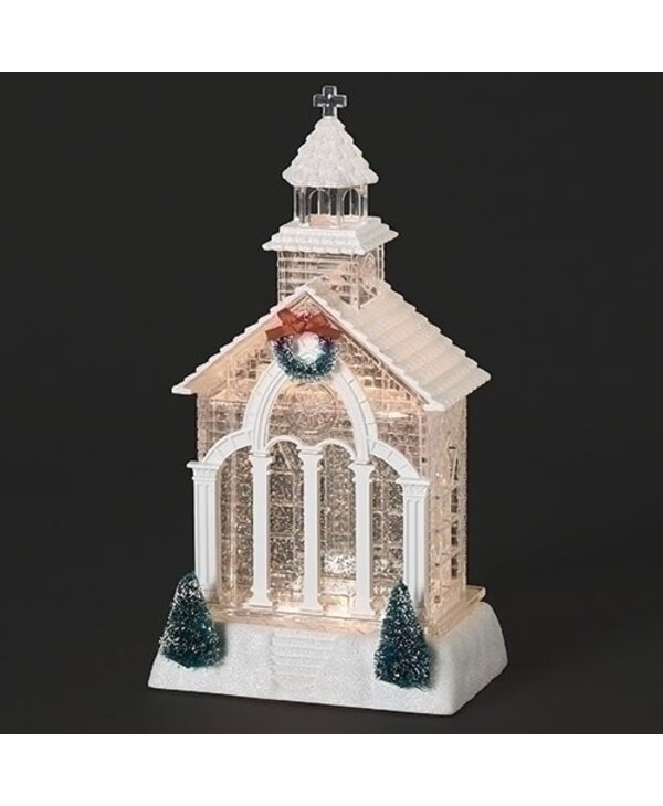 Create a festive and peaceful atmosphere with the 11.5" Lighted Swirl Church with Green Tree and Wreath. This beautifully detailed church scene features a swirl design and is adorned with a lush green tree and a holiday wreath, making it a perfect addition to your Christmas decor. The integrated LED lights illuminate the church, creating a warm, inviting glow that enhances the festive spirit. Standing at 11.5 inches tall, this charming piece can be displayed on a mantel, shelf, or as a centerpiece for a holiday display, bringing the peaceful beauty of a winter village to life.