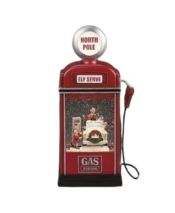Add a whimsical touch to your holiday decor with our 11.5 Inch Lighted Swirl Gas Pump North Pole! This unique piece features a North Pole elf serving up festive fuel, with a white truck full of elves, gifts, and Santa himself driving. Watch the swirling silver glitter and bring the holiday spirit to life. New for 2024!