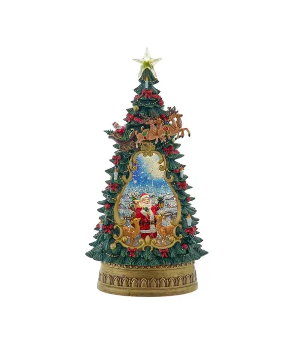 This enchanting treetop features a beautifully crafted scene of Santa and his trusty reindeer, illuminated by warm LED lights and enhanced by a mesmerizing swirl of spinning glitter water. The soft glow and glittering display create a captivating, festive atmosphere that will dazzle atop your tree or as a unique tabletop decoration. Powered by either batteries or a convenient USB connection, this treetop adds versatility to your holiday décor setup.