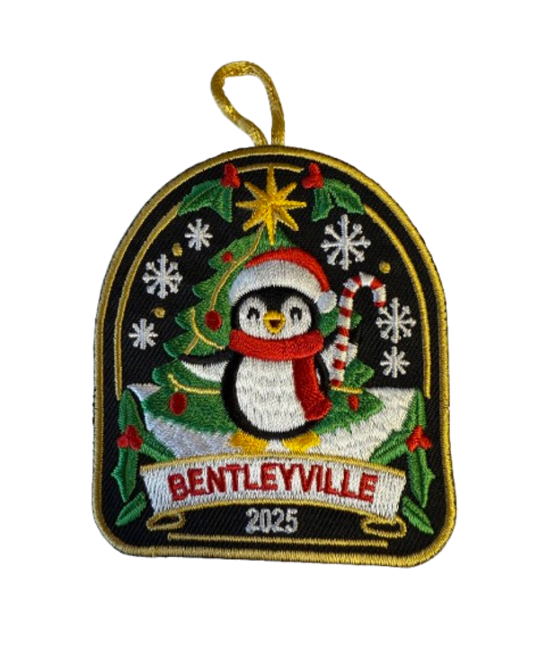 Featuring a cheerful penguin bundled up in a Santa hat and scarf, standing proudly in front of a sparkling Christmas tree, candy cane, and swirling snowflakes, this embroidered design captures the wonder of the holiday season. The golden star, holly accents, and bold “Bentleyville” banner make it a perfect memento from the nation’s largest walk-through holiday light display. A charming collectible to hang on your tree or gift to loved ones, this ornament celebrates the joy, sparkle, and spirit of Bentleyville 2025!
