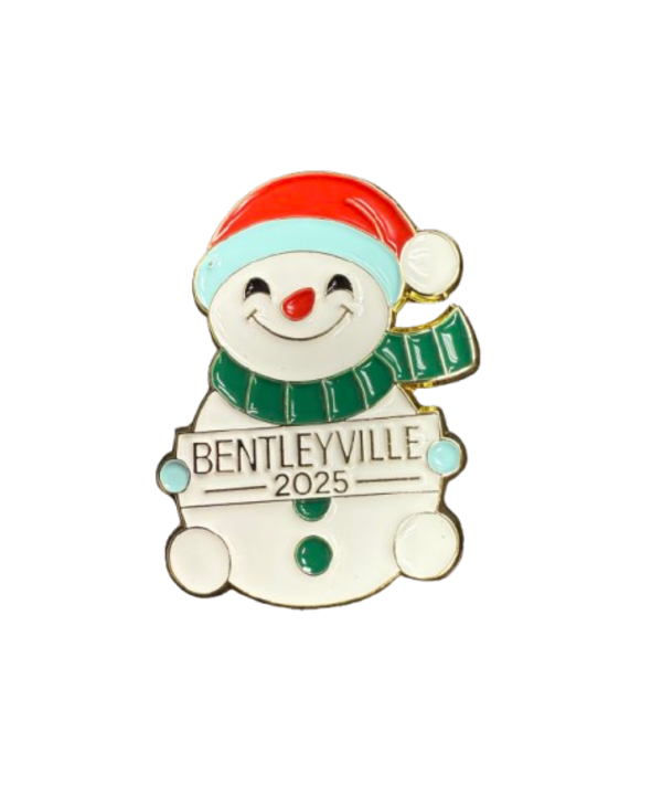 Bring home the magic of Bentleyville with this cheerful snowman pin, designed to warm hearts all season long. Featuring a jolly snowman with a bright red Santa hat, a cozy green scarf, and a big holiday smile, this collectible pin proudly showcases Bentleyville 2025. With festive enamel colors outlined in gleaming gold, it’s the perfect piece to pin on your jacket, hat, or bag as you stroll through the lights—or to treasure as a keepsake of your visit.