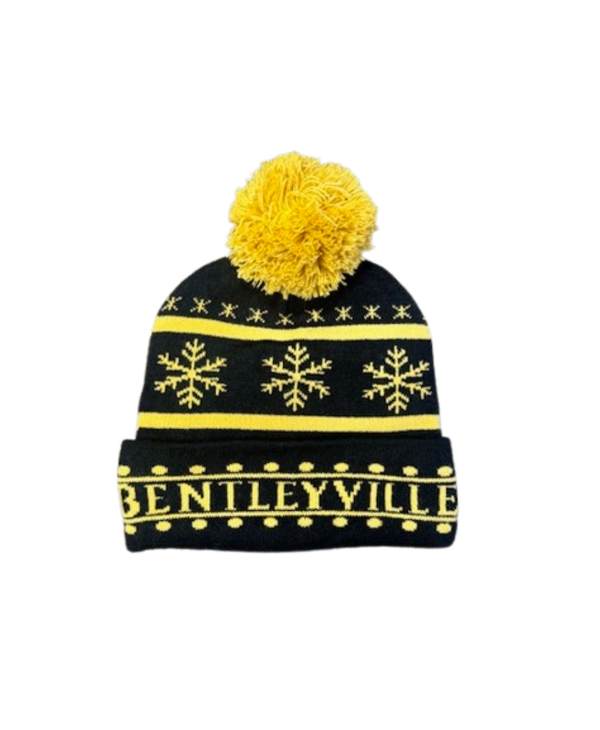 Cozy, cheerful, and ready for winter nights at Bentleyville! This knit beanie features bold yellow snowflakes and playful dotted trim on a deep black background, topped with a fluffy matching pom for extra festive flair....Read more