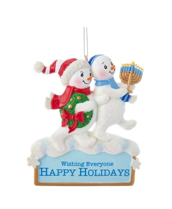 This Hanukkah and Christmas snowmen ornament is a unique and festive addition to your home or holiday décor. This ornament features a Christmas snowman holding a decorated wreath and a Hanukkah snowman holding a menorah "Wishing Everyone A Happy Holidays."