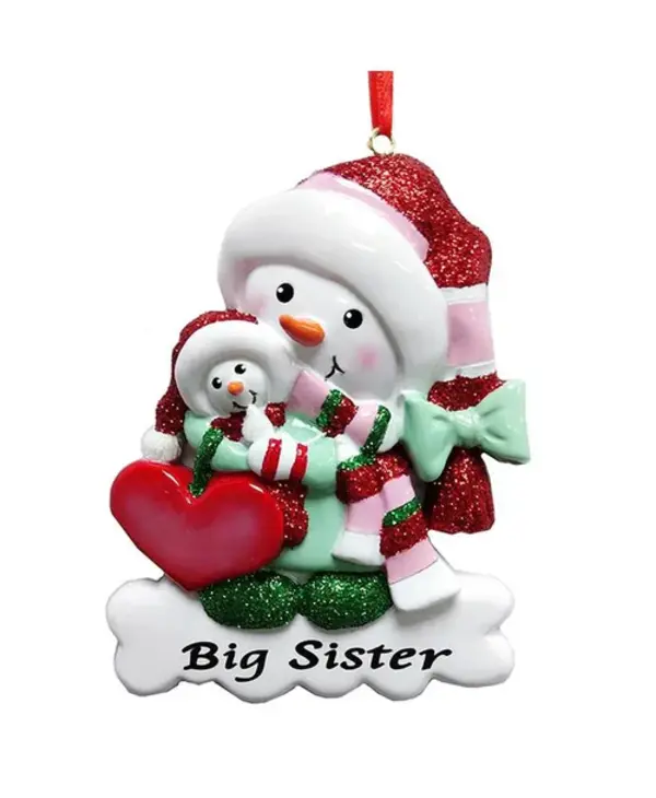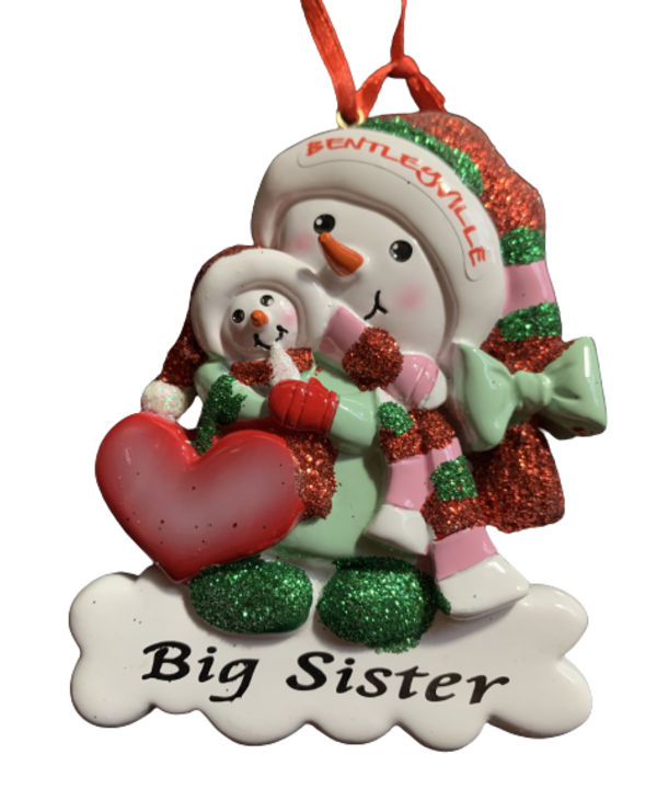 Featuring a "Big Sister" snowman holding their younger sibling and a red heart that can be personalized.