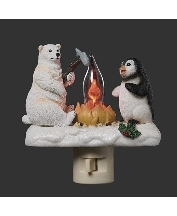 Bring a delightful touch of winter fun to your home with the 4.5" Polar Bear and Penguin Roasting Fish Nightlight. This charming nightlight features a playful polar bear and penguin roasting a fish over a cozy campfire, surrounded by a soft, glowing light. The perfect addition to your holiday décor, this whimsical scene adds warmth and cheer to any room.