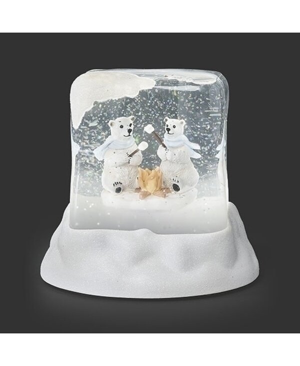 Bring a cozy, wintery charm to your holiday decor with the 5" Lighted Swirl Polar Bears Roasting Marshmallows. This adorable decoration features two polar bears roasting marshmallows over a small fire, surrounded by a swirl design. The soft glow of integrated LED lights creates a warm, inviting ambiance, perfect for adding a touch of holiday magic to any space. Standing at just 5 inches tall, this delightful scene makes a great addition to tabletops, mantels, or as part of your festive winter display.