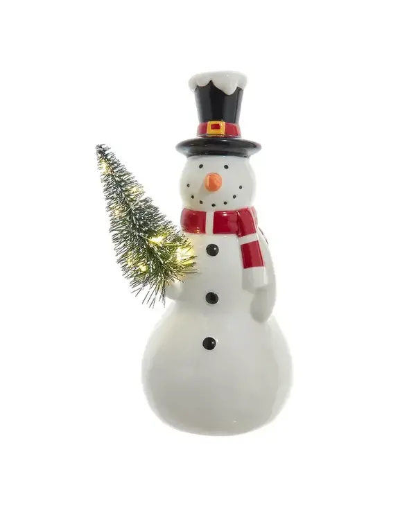 This delightful decoration combines the timeless appeal of a snowman with modern LED technology, creating a festive and whimsical centerpiece for your tabletop or any space in need of seasonal cheer. Measuring at a versatile 8 inches, this battery-operated table piece is designed for convenience and flexibility. You can place it on your dining table, mantel, or even use it as a delightful addition to your holiday centerpiece. The battery operation allows you to showcase this festive snowman without being restricted by the need for electrical outlets. The LED lights embedded in the snowy tree emit a soft and warm glow, casting a cozy ambiance that enhances the holiday spirit. The ceramic construction adds a touch of classic elegance to the piece, making it a timeless addition to your seasonal decor. With meticulous attention to detail, the ceramic snowman features a cheerful expression and festive accessories, capturing the heartwarming essence of the winter season. Whether displayed on its own or paired with other holiday decorations, this LED Lighted Ceramic Snowman Table Piece is sure to bring joy and festive charm to your home. Brighten up your space and spread holiday cheer with the delightful combination of LED lighting and a classic snowman design.