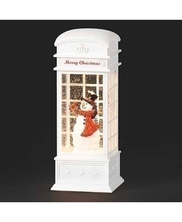 Bring a touch of holiday nostalgia to your decor with the 8"H LED Swirl White Phonebooth with Snowman & Holly. This charming lantern-style phone booth features a jolly snowman, complete with holly accents and a festive top hat, standing inside a beautifully designed white phone booth. As the LED lights glow, the snow inside swirls gently, creating a magical winter wonderland effect.