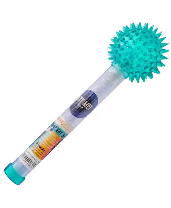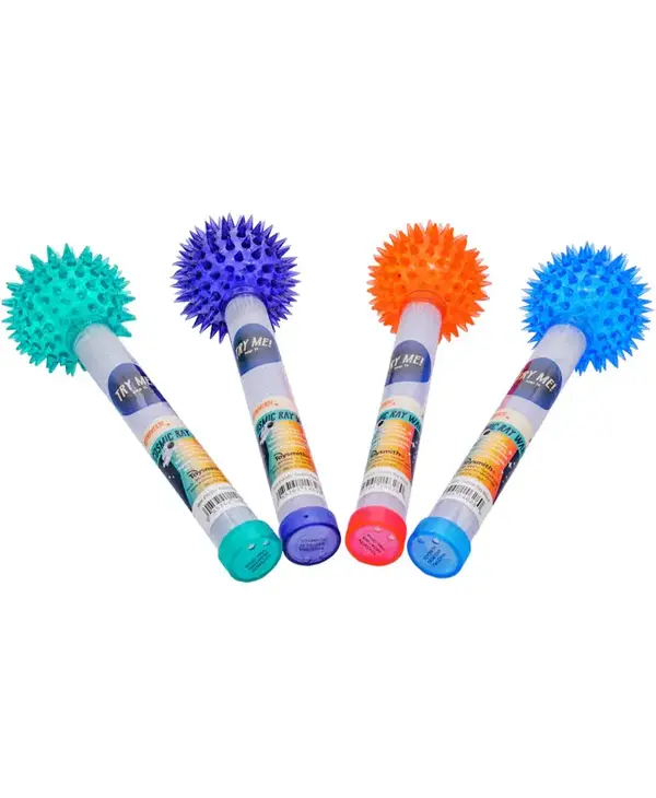 Wands have a squeezable soft rubber spiky top and come in 4 assorted colors. Available in turquoise, orange, blue, and purple.