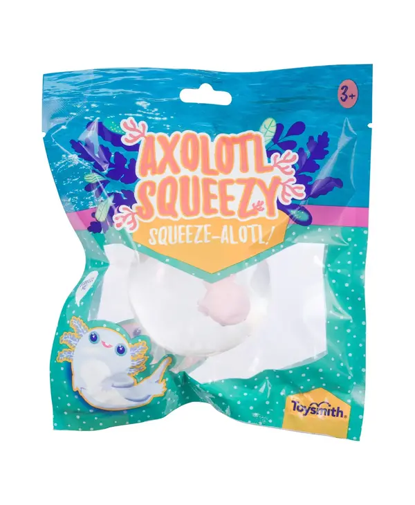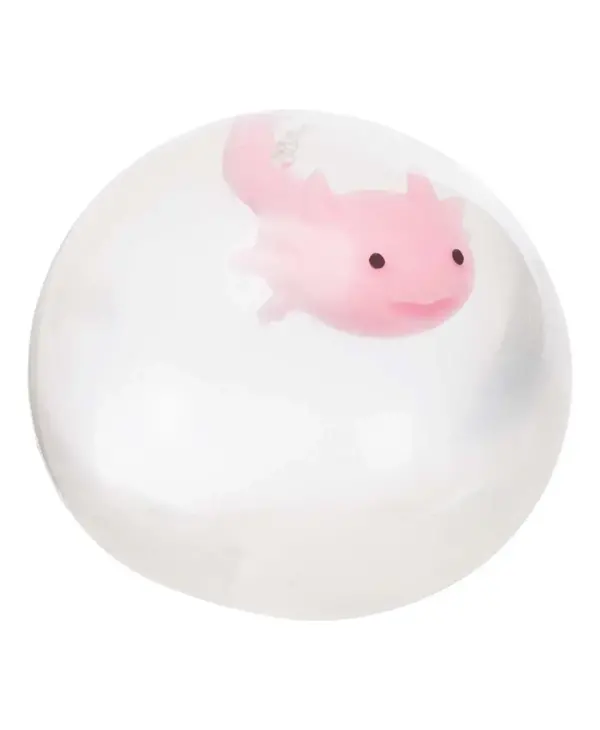 The Axolotl Squeeze Ball offers a unique tactile experience that delights. Each clear squeeze ball measures 2.5 inches in diameter, is filled with cloudy white slime and 1 plastic axolotl figure. Smiling axolotl figure comes in light pink or light blue coloring. You will receive one random color with purchase.