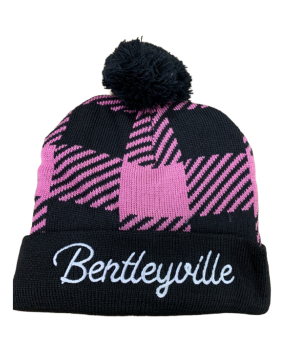 Bentleyville is mad for plaid, especially this knit pink buffalo plaid hat. You'll look like a lady lumberjack with its cuffed brim and black Pom Pom. Perfect for ski wear, snowboarding or any winter wear.