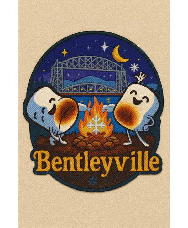 Toasty Nights, Starry Skies. Two happy marshmallows roast by the fire with the iconic Lift Bridge glowing in the background. This Bentleyville patch is a playful, cozy nod to evenings filled with laughter, warmth, and sweet holiday fun.