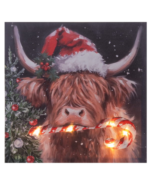 This festive Highland cow is lighting up the holidays—literally! Rocking a Santa hat and holly crown, this shaggy cutie chomps down on a glowing candy cane while snowflakes swirl all around. With twinkling LED lights built right into the artwork, it’s a merry mix of rustic charm and holiday sparkle. Perfect for cozy cabin walls, farmhouse vibes, or anyone who loves a little bovine brilliance in their Christmas décor!