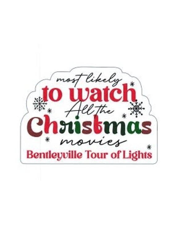 Celebrate your cozy-season spirit with this “Most Likely to Watch All the Christmas Movies” Bentleyville Tour of Lights sticker. With festive red-and-green lettering, playful snowflakes, and classic Bentleyville branding, this sticker is made for the holiday superfan who knows every line from every Christmas classic. Durable, vibrant, and perfect for water bottles, laptops, planners, or gift bags—it's the ultimate badge of honor for anyone who spends December wrapped in blankets, cocoa in hand, and the TV glowing with holiday magic.