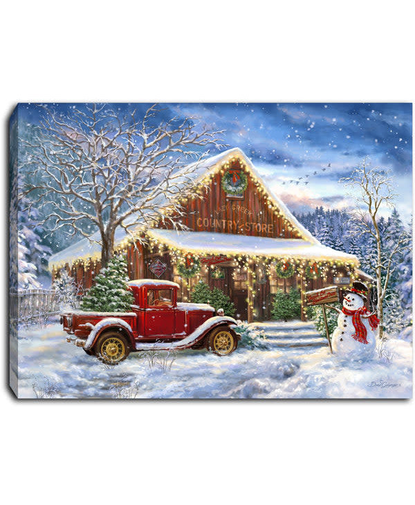 Celebrate the season of love and warmth with our Country Store 8x6 Lighted Tabletop Canvas. This charming piece of decor captures the essence of an old-fashioned Christmas scene, featuring a classic red truck adorned with a freshly cut snow-covered tree in its bed.