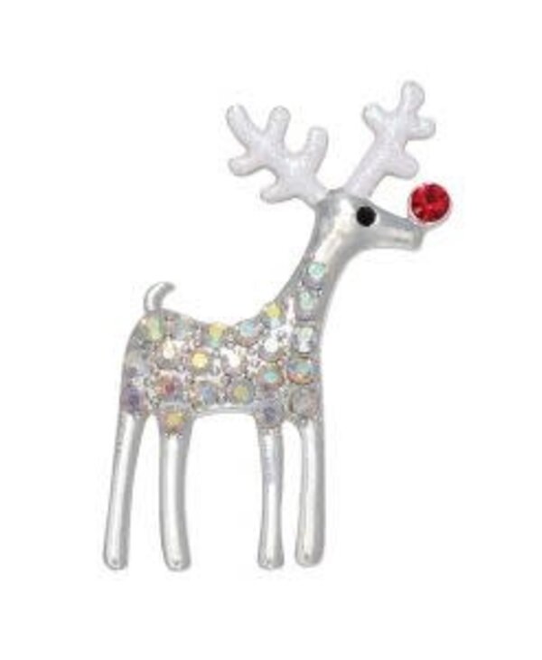 Celebrate the holiday season with this charming Rudolph the Reindeer brooch! Designed with a shimmering silver-tone finish, this adorable reindeer is adorned with dazzling iridescent rhinestones that catch the light beautifully. Its signature red nose, made from a striking red crystal, adds a festive touch, while black enamel detailing brings Rudolph’s features to life.