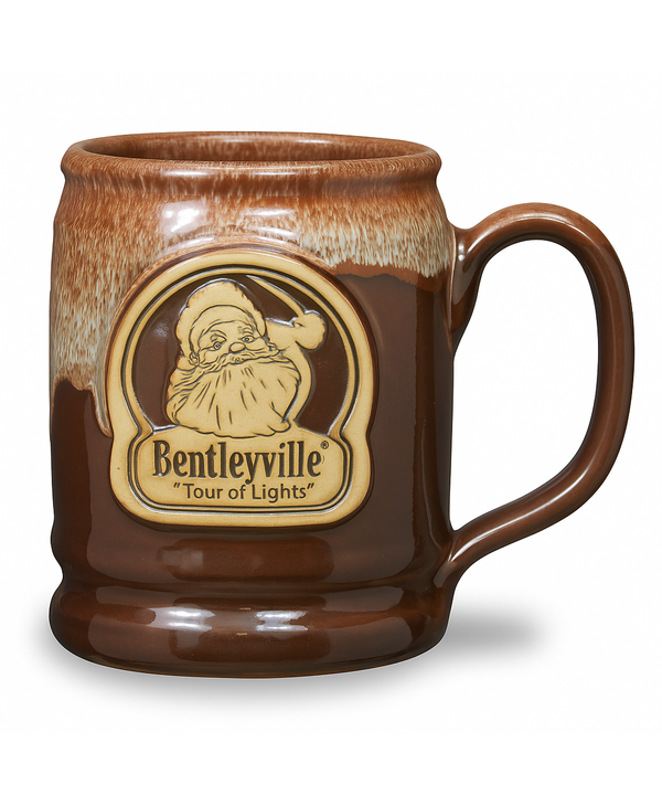 Warm up your winter nights with this artisan-made Bentleyville® mug by Deneen Pottery, handcrafted in the USA and designed to capture the cozy spirit of the Tour of Lights. Each stoneware mug features a rich, hand-dipped glaze and a raised clay medallion showcasing Santa himself—bringing the joy and sparkle of Bentleyville to every sip.