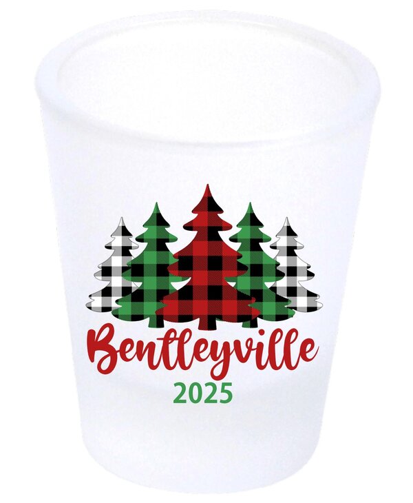 Cheers to holiday spirit! This frosted shot glass features the festive Bentleyville 2025 design with red, green, and black buffalo plaid trees. A perfect keepsake or gift for those who love celebrating under the lights.