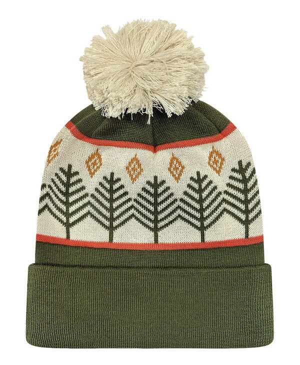Top off your outdoor look with this eco-conscious beanie, made from 100% post-consumer recycled PET. Featuring a cozy olive green cuff, cream and rust colorwork, and a forest-inspired tree pattern, it’s crowned with a playful pom for extra charm. Whether you're hitting the trails or sipping cocoa fireside, this beanie keeps you warm while treading lightly on the planet.