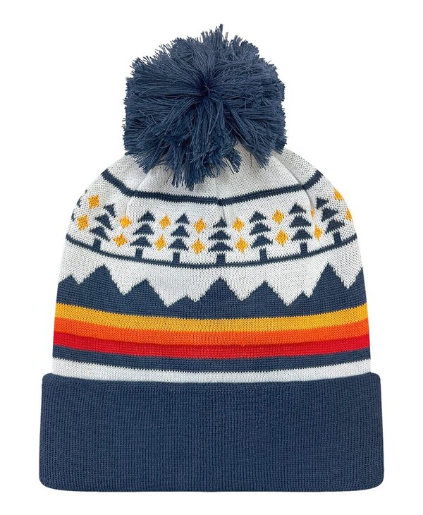 Embrace alpine vibes with this mountain-inspired beanie crafted from 100% recycled PET. Bold navy and sunset stripes rise into jagged peak silhouettes, while forest trees and golden diamonds add a pop of fun. Finished with a chunky navy pom, it’s your go-to for cozy comfort and sustainable flair from summit to sidewalk.