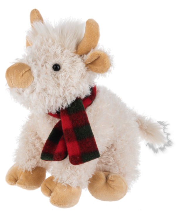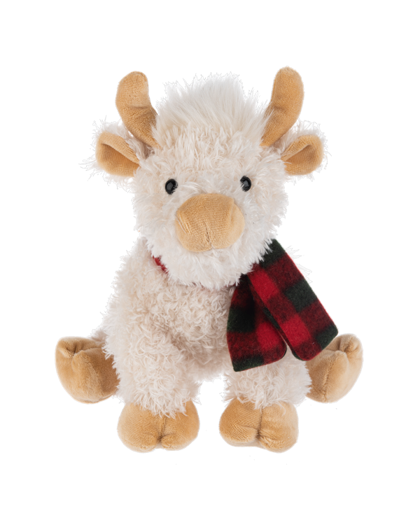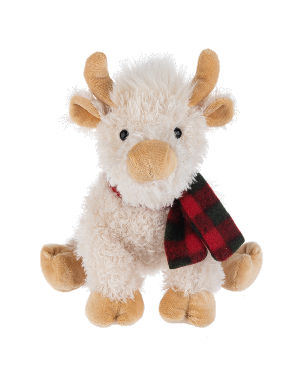 This fluffy Highland cow is serving festive charm with every snuggle! Featuring soft cream-colored fur, cozy tan hooves and horns, and a stylish red-and-black plaid scarf, this little cutie is ready to moooove into your heart. With its signature shaggy fluff and irresistible face, it’s the perfect cuddle buddy for winter nights or a whimsical addition to your holiday décor.