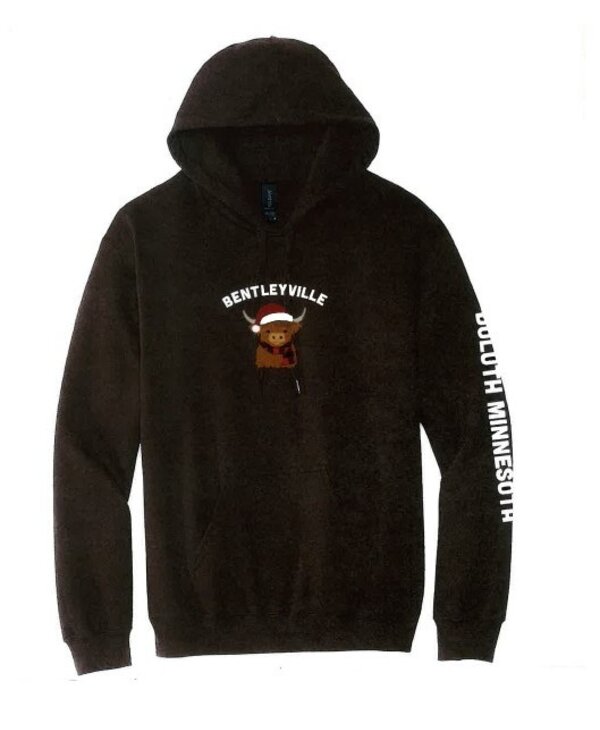 Warm up in true Bentleyville style with this cozy brown hoodie featuring the adorable marshmallow mug mascot — complete with a Santa hat and cheerful holiday charm! The design proudly displays Bentleyville across the chest and Duluth MN down the sleeve....Read more