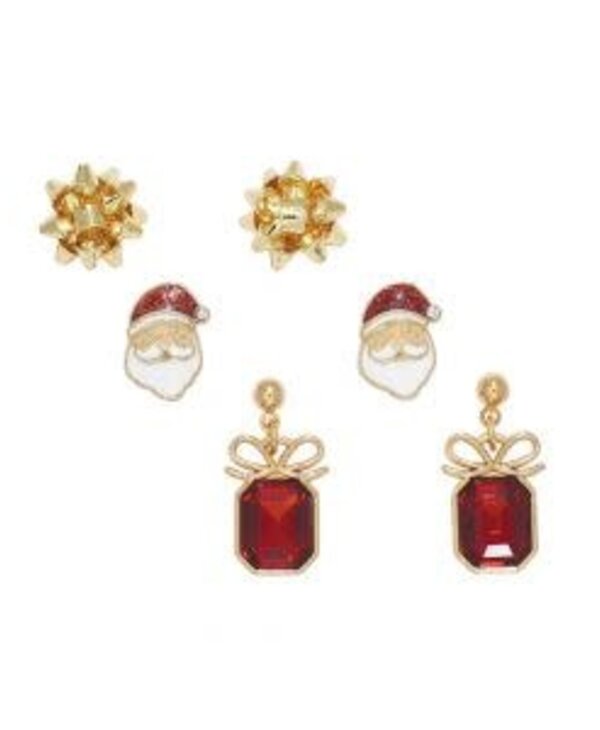 Add holiday sparkle to your look with this adorable Christmas-themed earring set, featuring three unique pairs: gold gift bows, Santa Claus studs, and dazzling red gem presents! Perfect for mixing and matching throughout the season.