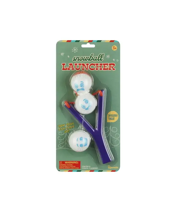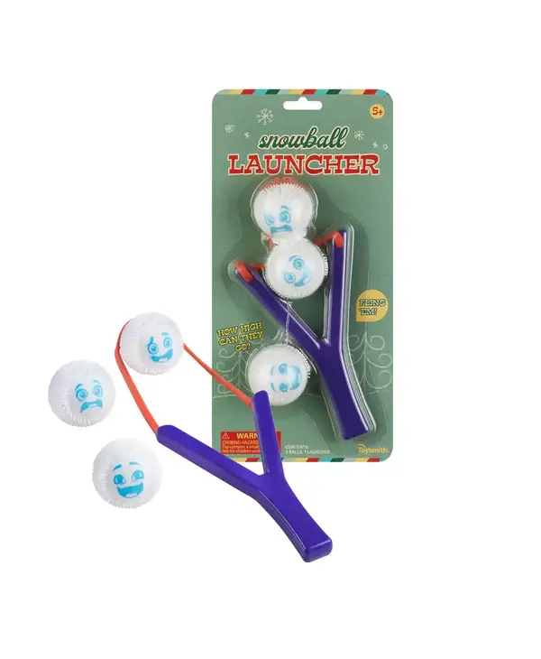 How high can they go? Pull back the slingshot and find out! Includes slingshot with blue handle and red rubber band attached and three small soft balls resembling the heads of snowmen. Each ball has a different expression. These little snowmen are excited and scared to fly through the air. Great stocking stuffer.