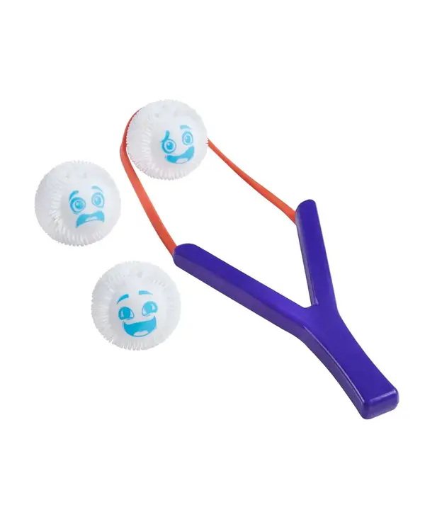 How high can they go? Pull back the slingshot and find out! Includes slingshot with blue handle and red rubber band attached and three small soft balls resembling the heads of snowmen. Each ball has a different expression....Read more