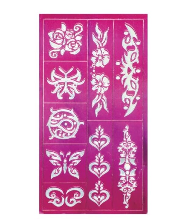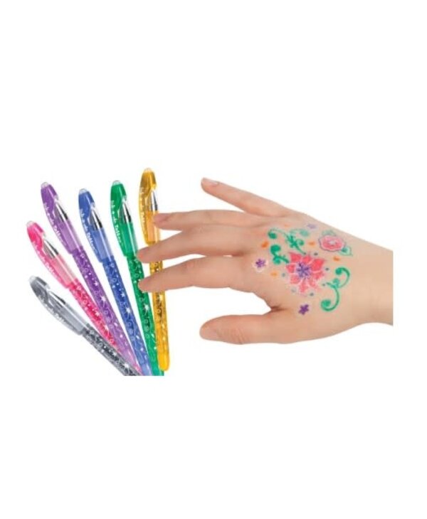 Each pack comes with 6 individual bright shimmering-colored pens including pink, yellow, green, blue, purple, and silver. Stencils include a variety of shapes and designs, including flowers, butterflies, and hearts. Gel pen ink is nontoxic and completely washable, so tattoos are easy to put on and take off.