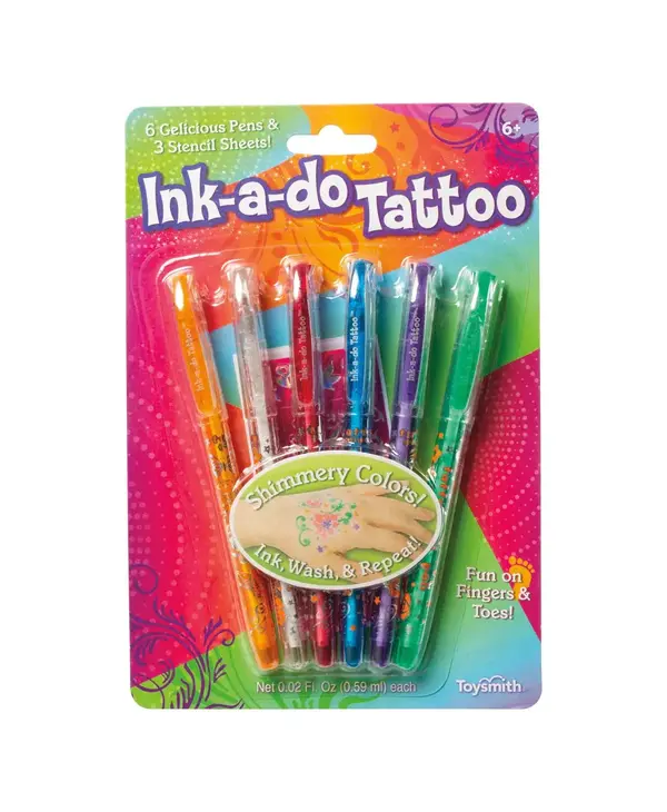 Ink-a-Do Tattoo Gel pens are a super-fun, popular temporary body art gel pen set. Includes 6 vibrantly colored gel ink tattoo pens and 3 stencils....Read more