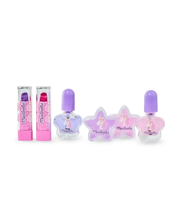 This fun unicorn makeup set will delight the little ones. Set contains two glitter nail polishes, two glitter lip balms, and two lipsticks. Impossible to resist!