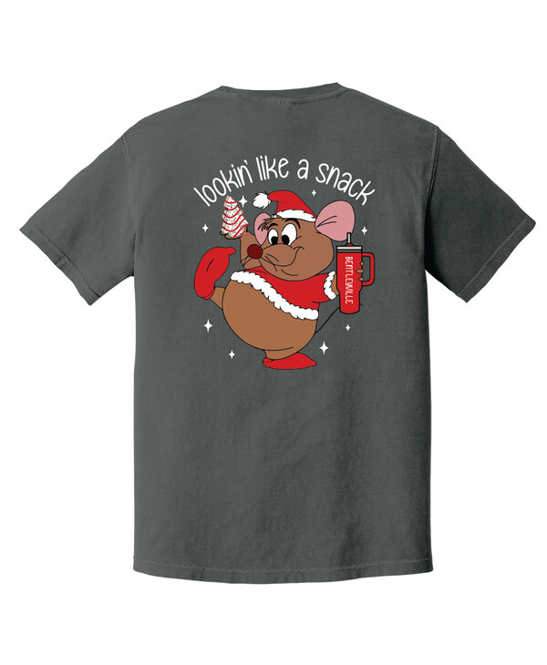 Featuring our festive “Lookin’ Like a Snack” mouse proudly sporting a Santa hat and holding a Bentleyville cocoa mug, this tee adds a playful holiday touch to your bedtime or lazy morning look. Made from soft, garment-dyed cotton for that worn-in comfort, it’s ideal for movie marathons, cocoa sipping, or twinkling under the lights. Pair it with the matching pants for the ultimate Christmas cozy set!V