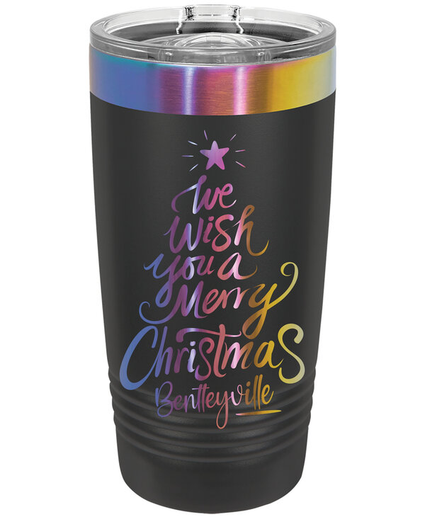 Bring the sparkle of the season wherever you go! This elegant black tumbler features a shimmering rainbow script forming a Christmas tree topped with a star....Read more