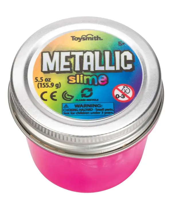 Metallic Slime is vibrantly colored and shimmers like metal for an incredible visual and tactile experience. Each Metallic Slime nonstick putty comes sealed inside a travel-friendly plastic 2.75-inch jar to keep it contained when not in use and make it ideal for grab-and-go play. Available in an assortment of shimmering colors, including pink, blue, purple, and green.