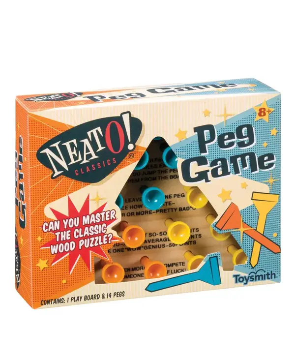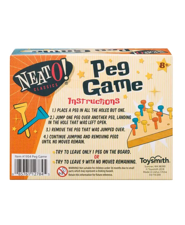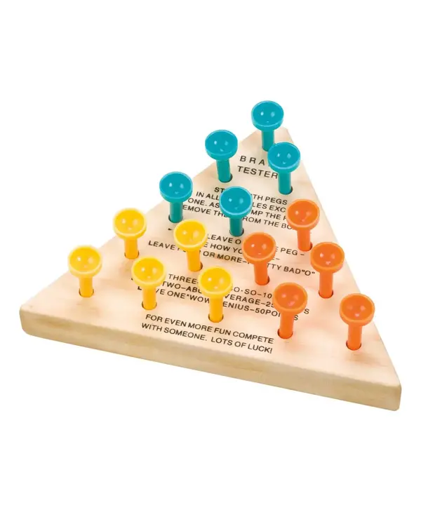 This Classic Wooden Peg Game includes a 4.75-inch wooden triangle base and 15 colored pegs. Pegs are blue, yellow, and orange in color. 5 of each color are included. All the rules are printed in black ink onto the board’s face, so it’s easy to learn and play on the go.