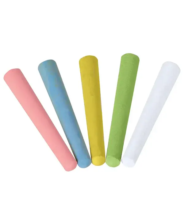 Chalks come in pink, green, blue, yellow, and white. All chalks are suitable for indoor use on a chalkboard or outdoor use on brick or sidewalk surfaces.