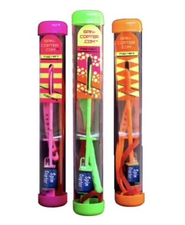 Brilliant toy for the sky that lights up the night, looks like a firework going up and descends slowly in a colorful array of light. Super fun, with LEDs that can be seen from half amile away. The extra strong, quality rubber bands easily blast Spin Copter 150 feet into the sky for an exciting show over and over again. For the Wow!
