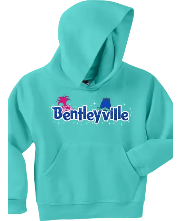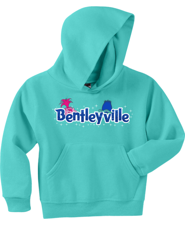 Vibrant turquoise hoodie with colorful Bentleyville Trolls design