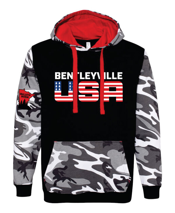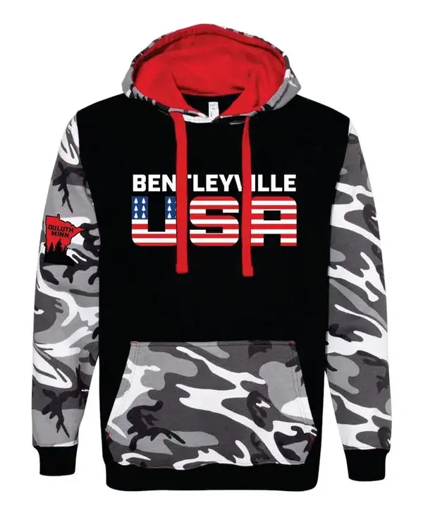 Show off your Bentleyville pride with bold, patriotic style! The Bentleyville USA camo hoodie combines red, white, and blue flair with rugged comfort, featuring a striking American flag–inspired logo across the chest and a red-lined hood....Read more