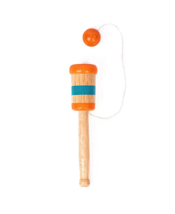 Beautifully designed with a shiny orange wooden ball tethered to the base of the blue-and-orange striped wooden cup by a cotton string. Measures 7.5 inches long. The handle is round with a bulbous end for easy gripping. Crafted with sturdy, high-quality wood for a classic look and long-lasting play. Great for hand-eye coordination as well as reflex, agility, and balance.