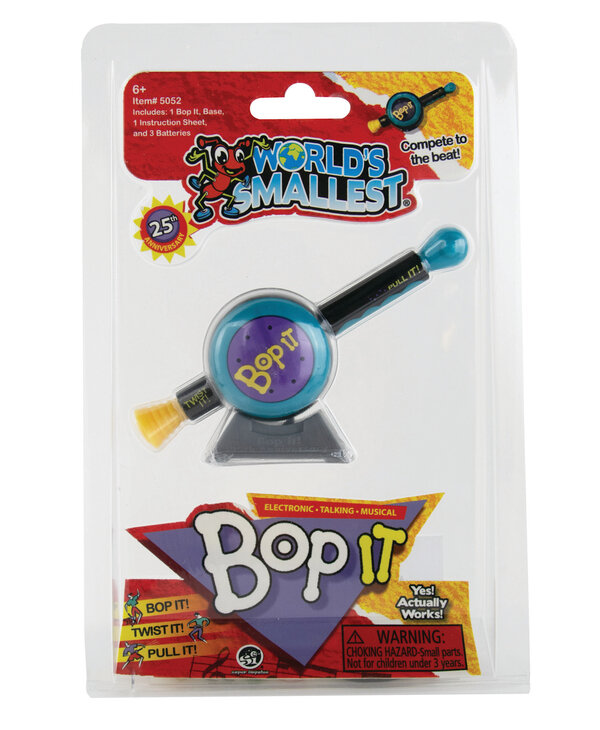 Celebrate the 25th Anniversary of your favorite 90’s reflex game with the World’s Smallest BopIt! For years, players have loved the simple and exciting “Bop It, Twist It, Pull It” actions featured in this iconic electronic BopIt game.