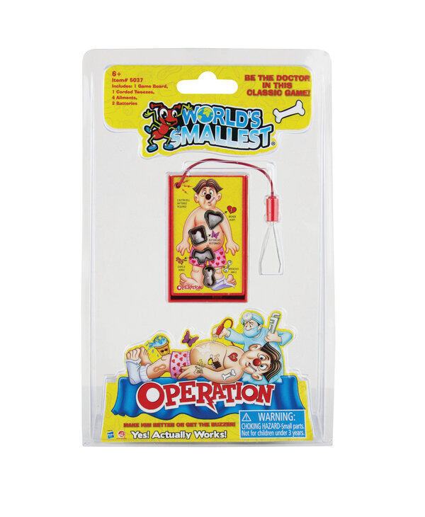 - The classic Operation board game is now available in the world’s smallest size measuring only 2.75 x 0.625 x 1.75 inches.