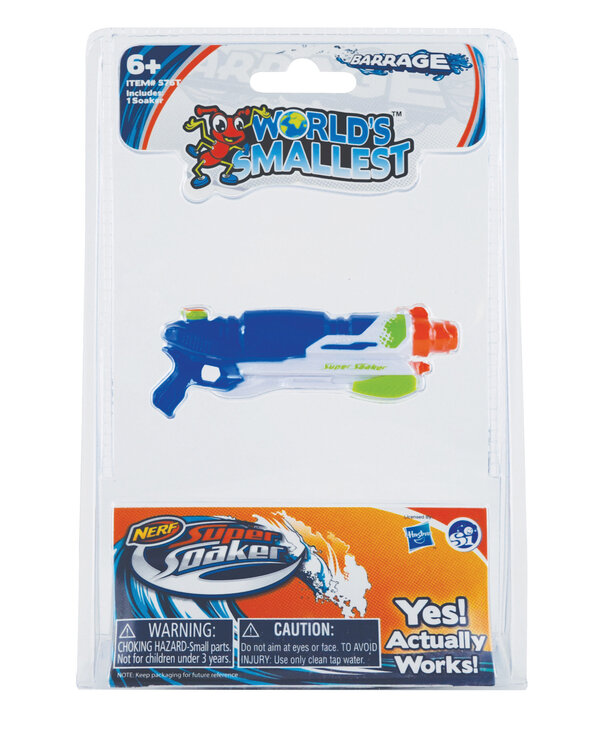 Yes, it actually works! Based on the best-selling, best-performing water squirters of all time! Less than 4 inches in size, each one squirts a dozen shots up to a distance of 25 feet! Featuring three styles – the iconic Super Soaker 50, Scatter Blaster, and the new, popular Super Soaker Barrage.