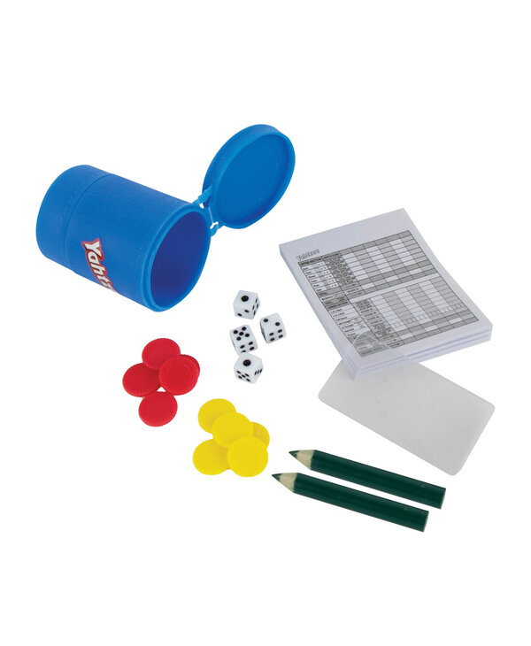 - Includes 1 Cup, 5 Dice, 10 Chips, 2 Pencils, and Score Cards. Shake, roll, and score your way to victory with this ultimate mini version of the timeless game!